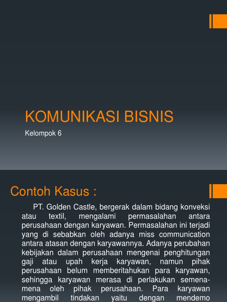 Contoh kasus, komunikasi pt golden castle ,bergerak dalam bidang konveksiatautextil, mengalami permasalahan antara perusahaan dengan karyawan. Nurul fiqih budianti kelas : Jun 07, 2015 · kasus komunikasi bisnis dalam dunia industri. Apakah komunikasi bisnis adalah komunikasi bisnis?