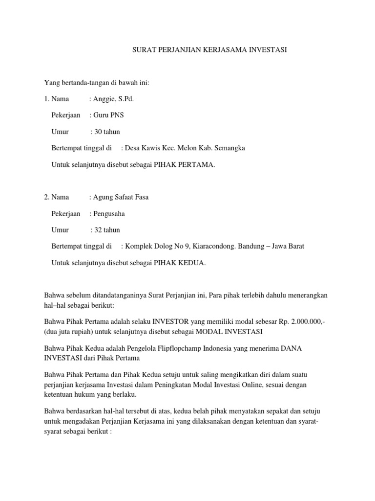 Fotokopi surat tanda lahir / akte lahir pasal 16 tindakan kriminal (1) jika pihak pertama terlibat dalam tindak kejahatan kriminal, baik pidana atau perdata, maka perjanjian dibatalkan, dana pokok investasi dan dana profil dikembalikan maksimal 1 minggu atau 7 (tujuh) hari sejak dikeluarkannya surat keterangan dari pihak kepolisian republik. Contoh surat perjanjian investasi bagi hasil Contoh surat perjanjian kerjasama investasi berikut ini akan memaparkan bagaimana format surat yang benar. Anda dapat mengubah pasal dan isi surat perjanjian di atas sesuai dengan kepentingan anda.
